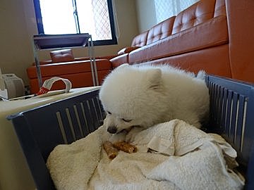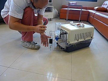 可是球球可能是到新環境~有點緊張~要咬人~不肯出籠子~所以陳醫師們就把籠子拆開來~