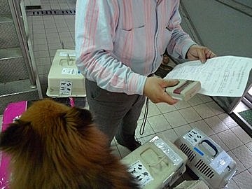 一切就續後~就進入隔離籠檢疫了~陳小姐很捨不得的跟博美講話~>”<~別擔心啦~二十一天很快就過去了~