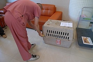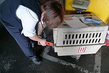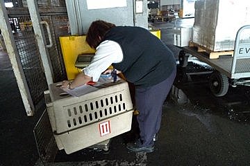 到了桃園機場後~檢疫官正在核對狗狗的資料~