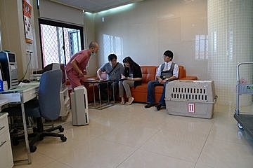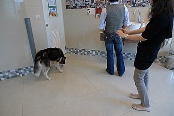好啦~哈士奇要準備做隔離檢疫了~王先生一臉的捨不得~>”<~別擔心啦~陳醫師會好好照顧他的啦~^^