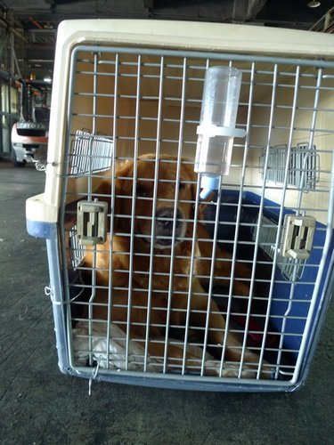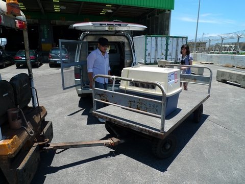 檢疫官做完檢疫後~就讓狗狗進入運輸籠~