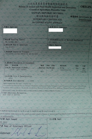 接完狗狗後~馬上前往檢疫站辨理台灣的輸出許可~
