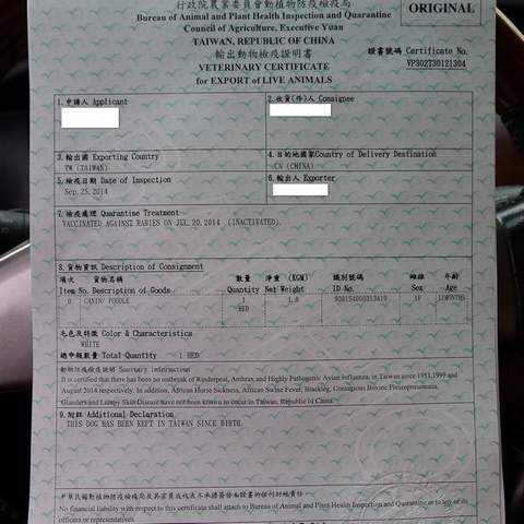 很快的~台灣的輸出許可就到手啦~再把狗狗送回給李先生~就完成這次的任務囉~^^