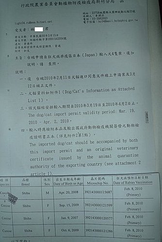 收到林先生的狗狗資料後~馬上申請台灣的輸入許可~