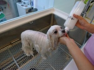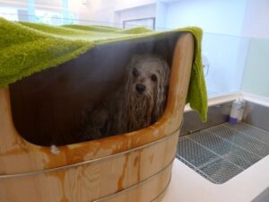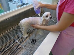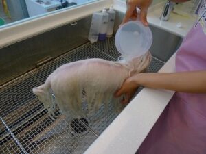 先在特別訂做的洗狗糟中將全身淋溼~