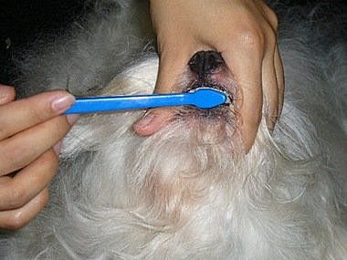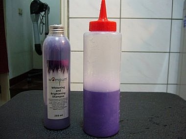 洗完第一道抗過敏洗毛精後 ~先用去污濃縮美白洗毛精的原液抹在淚線和嘴邊毛和腳掌的鐵鏽色上~